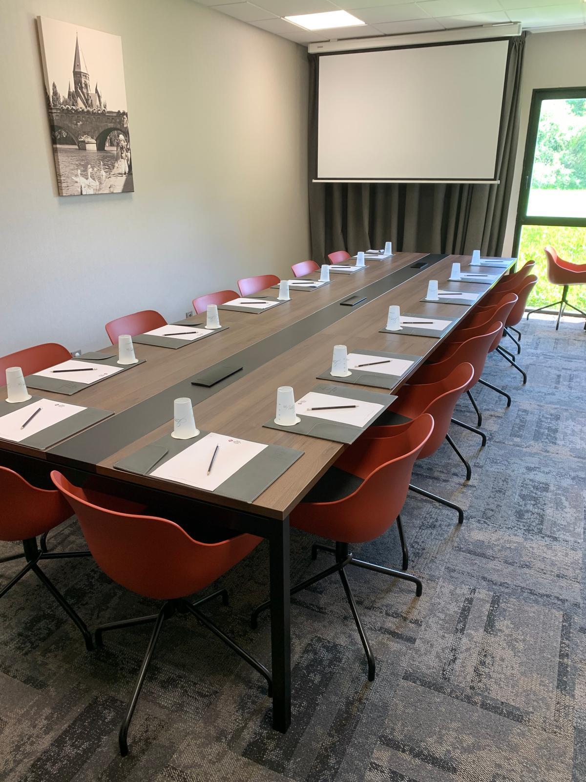 Ces 2 salons bénéficient d’un ensemble mobilier table et chaise entièrement neuf de juin 2024. Idéal pour des Comités de Direction, des Conseils d’Administration ou encore des formations, vous serez confortablement installés, à la lumière naturelle et vue sur le jardin de l’hôtel. Ces 2 espaces de réunion sont les seuls de l’établissement qui ne sont pas modulables car le mobilier de la salle est fixe.